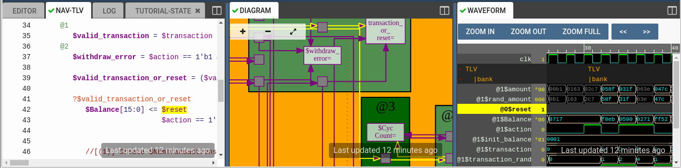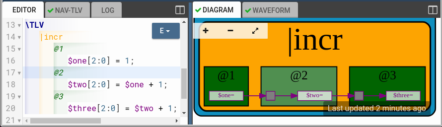 TL-Verilog constructs in the code editor, diagram, and waveform viewer are all linked together. Clicking an element such as a signal in one view will highlight that element across all views.