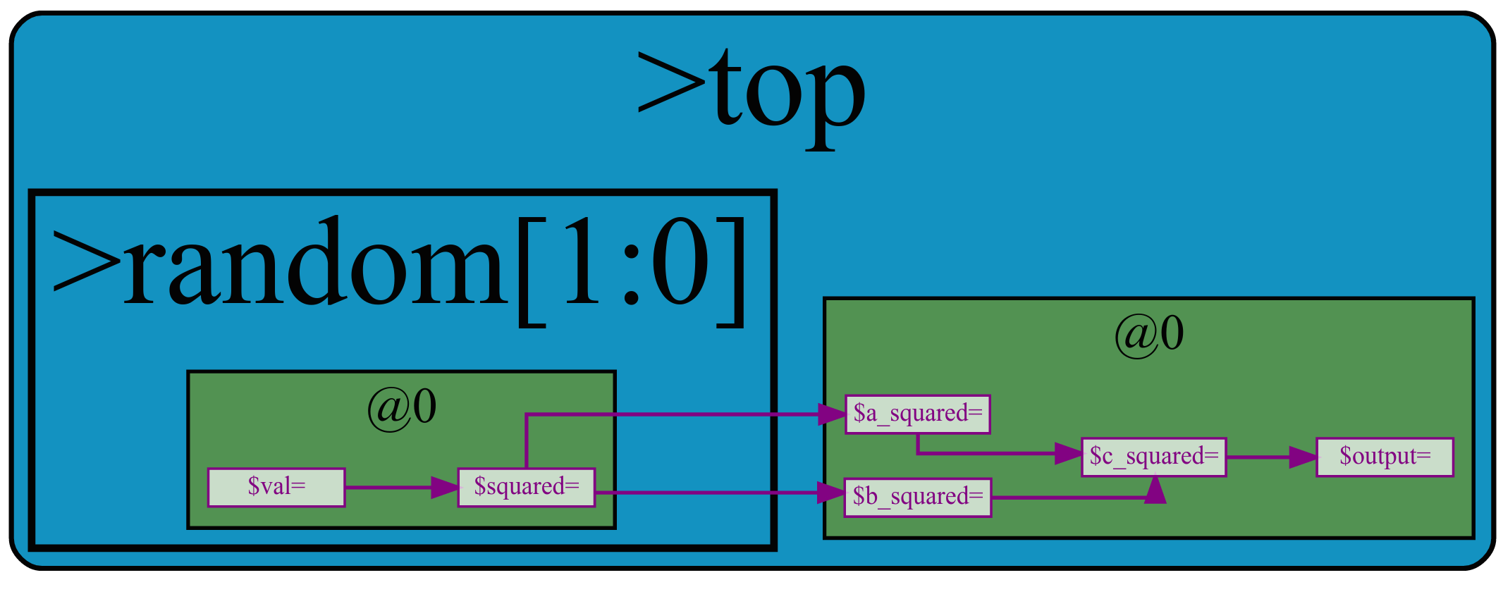 The code below provides a pipeline, called |incr containing pipeline stages @1, @2 and @3. Each stage increments the value from the previous stage by one in a subsequent clock cycle. Flip-flops (represented as grey squares in the diagram) carry values from one stage to the next.
